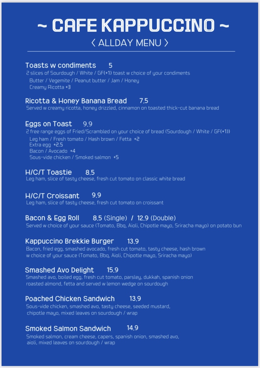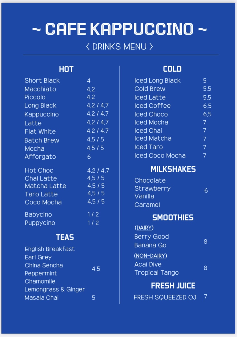 Speaking of coffee, the menu at Cafe Kappuccino is impressive. From a robust Short Black to the velvety touch of a Kappuccino or the perfectly layered Latte, there's something to satisfy every palate. For those who enjoy a sweet treat alongside their daily caffeine fix, the Mocha and Affogato are must-tries, particularly if you're seeking that perfect blend of coffee and dessert. Furthermore, health-conscious patrons will appreciate options like the Matcha Latte and dairy-free smoothies, as noted by the satisfied customer Chloe Pappas.